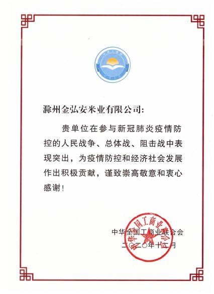 在活動中,張主席代表工商聯,向金弘安米業張總授《中華全國工商業聯合會“抗疫先進民營企業”》榮譽證書。
